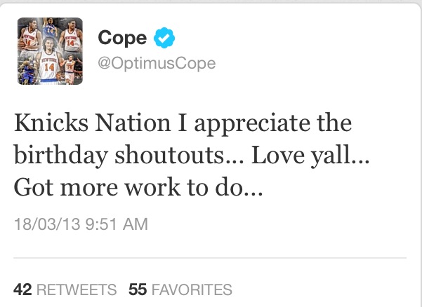 It looks like the Knicks 5th youngest player is now 29. Happy Birthday Cope!