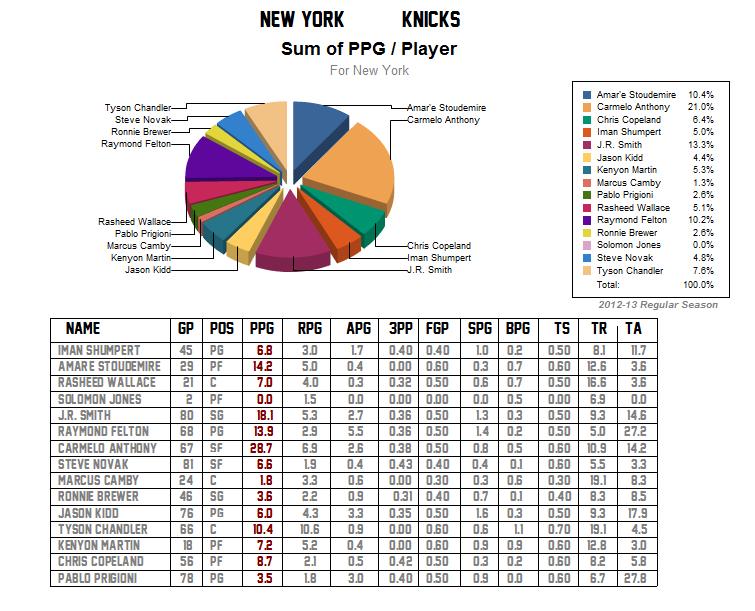 A big thanks to Patrick for making these charts. So we’ve been talking about how the Knicks offense is predictable when Melo and/or JR is on the floor and stagnant when they are off. And this chart would be even more skewed if you consider Amare missed 53 games last season. This breakout of team scoring pretty much sums that up: