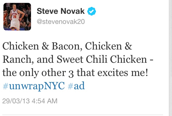 Steve Novak has been making the rounds promoting McDonalds and even had a live unveiling of their new wraps. Apparently he’s very excited about them. Not enough to actually taste them of course, but enough to tweet about them.